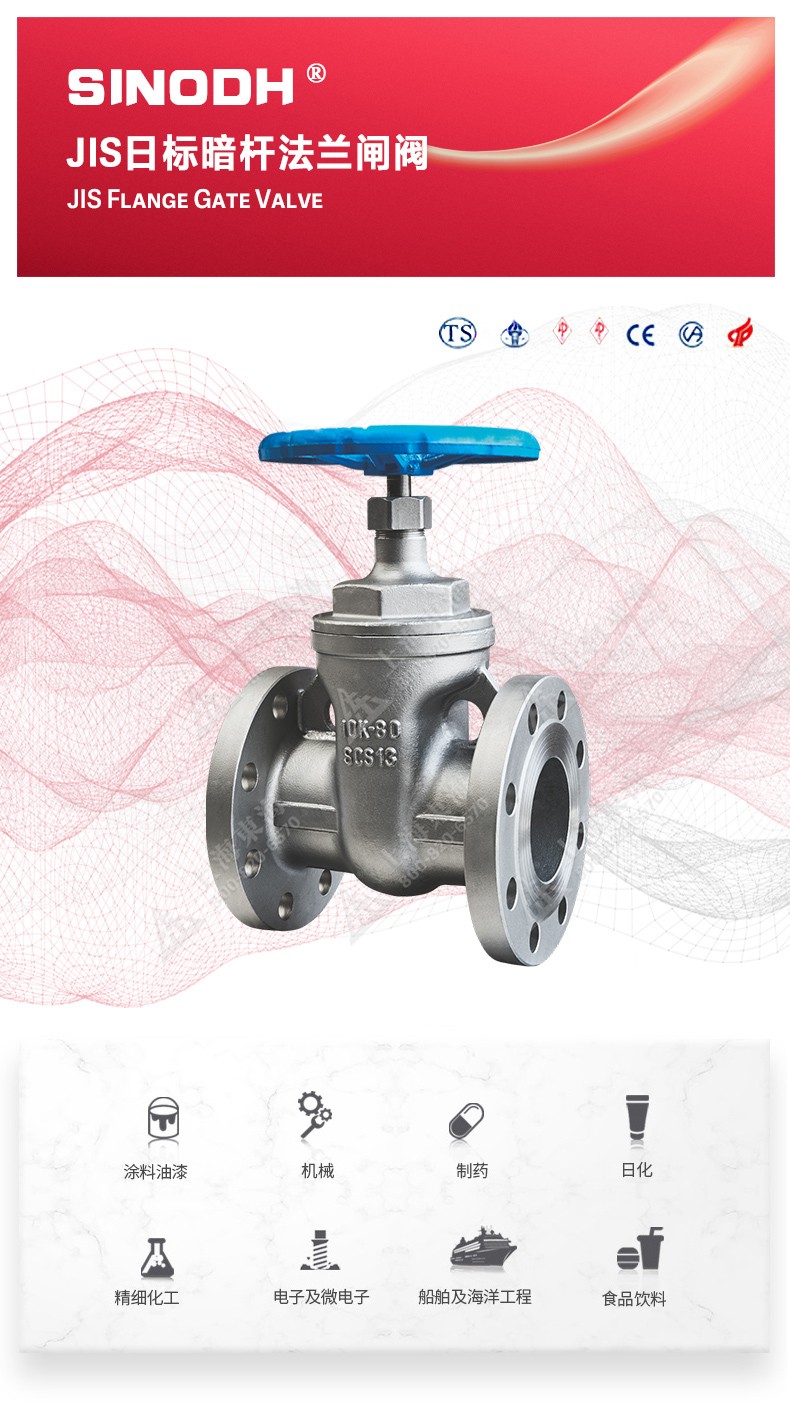 JIS日标暗杆法兰闸阀,为荣耀体育在线登录入口,首页自主研发生产。本产品设计制造标准符合JISB2071标准,该产品是一种最常见的启闭阀,利用闸板的上下工作来接通(全开)和截断(全关)管道中的流体介质。